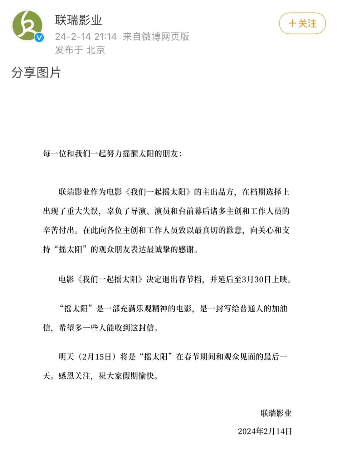 2月14日晚,据“联瑞影业”发布的微博,《我们一起摇太阳》宣布退出今年的春节档,2月15日为该片在春节档上映的最后一天。据悉,该片将延后至3月30日上映。