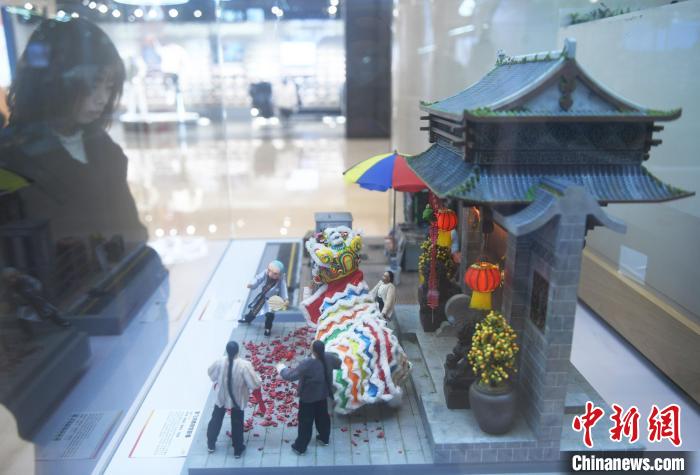 图为市民参观微型艺术景观“黄飞鸿舞狮贺新春”。中新网记者周毅摄