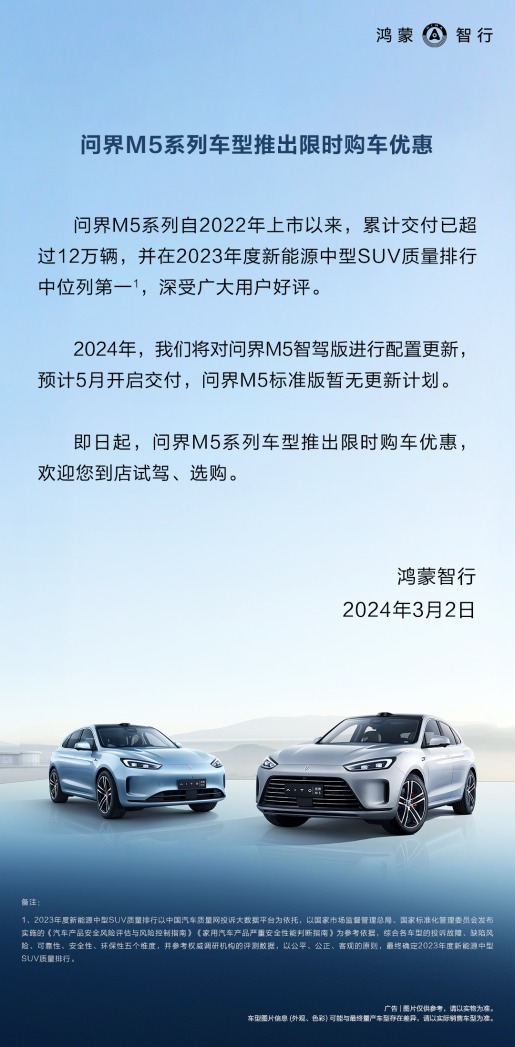 鸿蒙智行表示,问界M5系列自2022年上市以来,累计交付已超过12万辆,并在2023年度新能源中型SUV质量排行中位列第一,深受用户好评。2024年,将对问界M5智驾版进行配置更新,预计5月开启交付,问界M5标准版暂无更新计划。